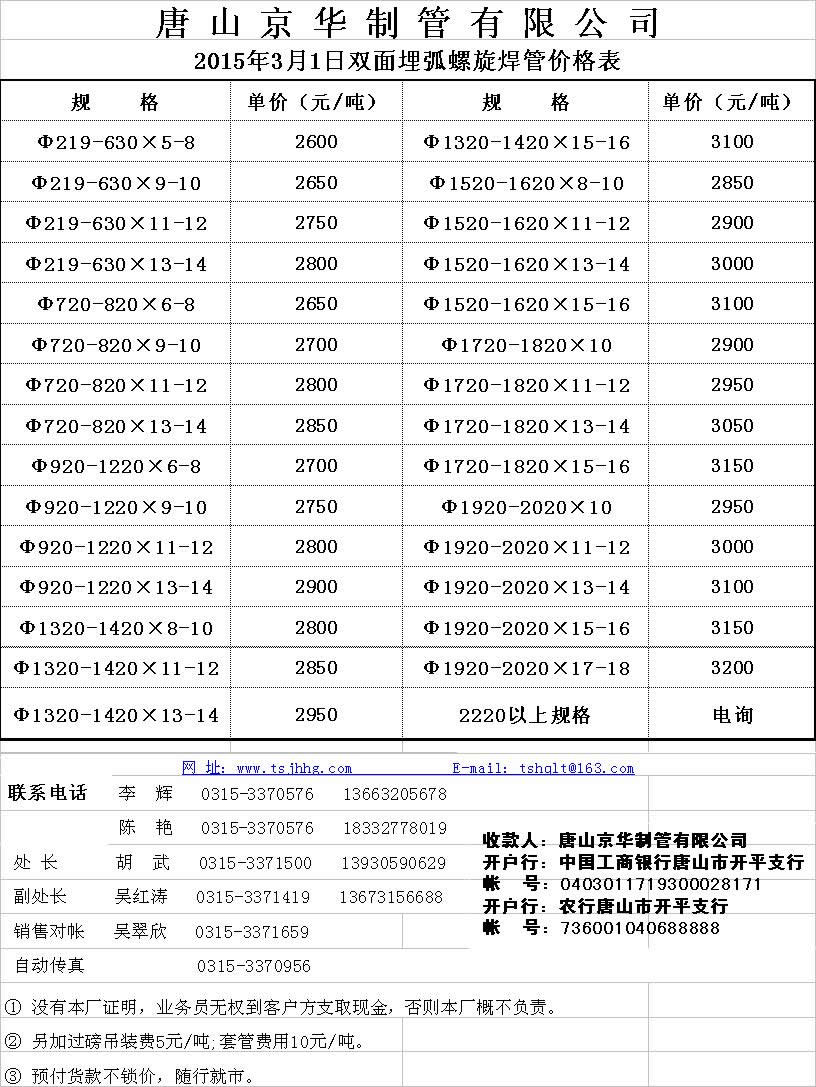 唐山京华2015年3月1日焊管价格表(长度为5.95、6米最低出厂限价、检斤价)