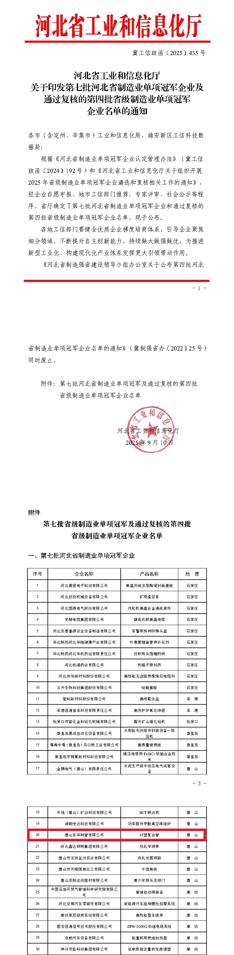 近日,河北省工业和信息化厅公布了2025年度河北省制造业单项冠军企业名单,公司生产的衬塑复合管产品成功入选,获得“河北省制造业单项冠军企业”认定。